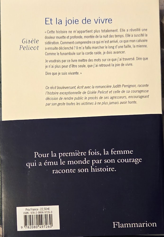 Ce récit autobiographique de Gisèle Pelicot, écrit avec la romancière Judith Perrignon, raconte l’épreuve intime et publique qu’elle a traversée. Victime d’agressions d’une violence extrême, elle choisit de rendre public le procès de ses agresseurs afin de briser le silence et la honte qui pèsent trop souvent sur les victimes. À travers ce livre publié chez Flammarion, elle met des mots sur la sidération, la douleur, la reconstruction et le long chemin pour comprendre ce qui lui est arrivé. Plus qu’un témoignage, c’est un acte de courage : affirmer qu’elle est vivante, qu’elle n’a plus peur d’être seule, et redonner force et dignité à toutes celles et ceux qui ont subi des violences.